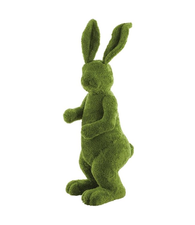 This decorative Bunny Figurine is sculpted in a standing, upright posture with long ears and is entirely covered in a textured, soft, moss-like material. It is perfect for seasonal or festive display in any home decor.
