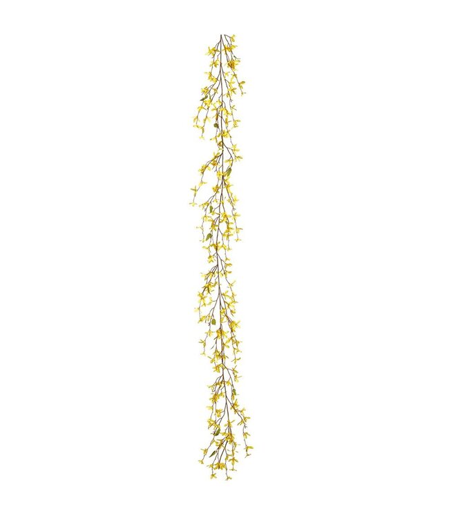 This vibrant Forsythia Garland features a long, trailing vine densely covered with abundant small, four-petaled blooms on thin, branching stems. It is perfect for display in any home decor.