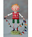 This enchanting figurine depicts a sweet and friendly boy dressed in a red nordic reindeer sweater with white collared shirt and green striped shorts.