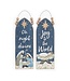 Dark blue galvanized tin wall hanging with wire hangers. The designs and messages on both wall hangings feature artwork of the Holy Family and the message, 'O Holy Night'.