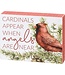 A wooden box sign featuring a watercolor cardinal on branches designed with the "Cardinals Appear When Angels Are Near" sentiment and red-colored natural wood sides for added interest. This Cardinals box sign is easy to hang or can free-stand alone.