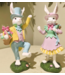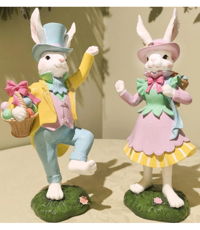 Charming Easter bunnies dressed in pastel outfits, each wearing a festive hat and holding springtime accents. Perfect for adding a cheerful, whimsical touch to your holiday décor. SOLD INDIVIDUALLY