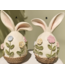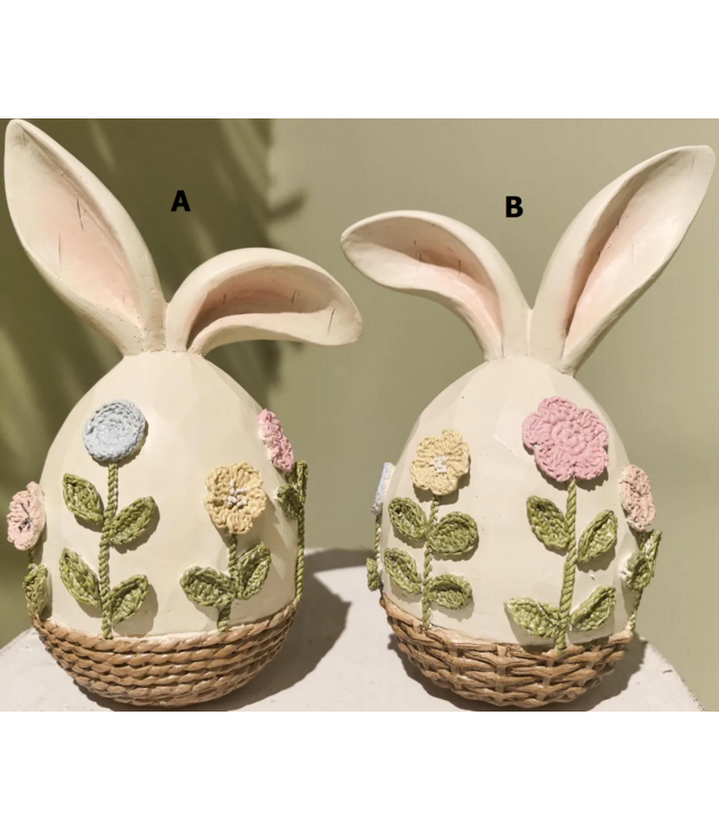 This charming Bunny Head decoration features a rounded base with prominent ears, adorned with textured floral appliqués and a woven basket-look bottom. It is perfect for display in any home decor. SOLD INDIVIDUALLY
