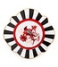 Top the table with this ceramic bread & butter plate that’s decorated with a red cardinal and floral toile pattern in the center, edged with black and white stripes, and trimmed with gold lustre.