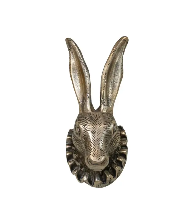 This Cast Aluminum Rabbit Head with a ruff collar in an antique brass finish is a unique and whimsical piece of wall decor. Made of aluminum, it adds a touch of character to any space, making it perfect for farmhouse, antique, cabin, or rustic decor style