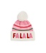 This whimsical knitted beanie features "FA LA LA" embroidered on its folded brim, showcasing varied tones. The main body is adorned with playful stripes, and it's crowned with a fluffy pom-pom, offering a festive and cozy accessory for chilly days.