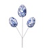 Each of the three decorative eggs is fully wrapped in a classic blue and white toile fabric, featuring detailed monochromatic floral and botanical illustrations.