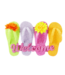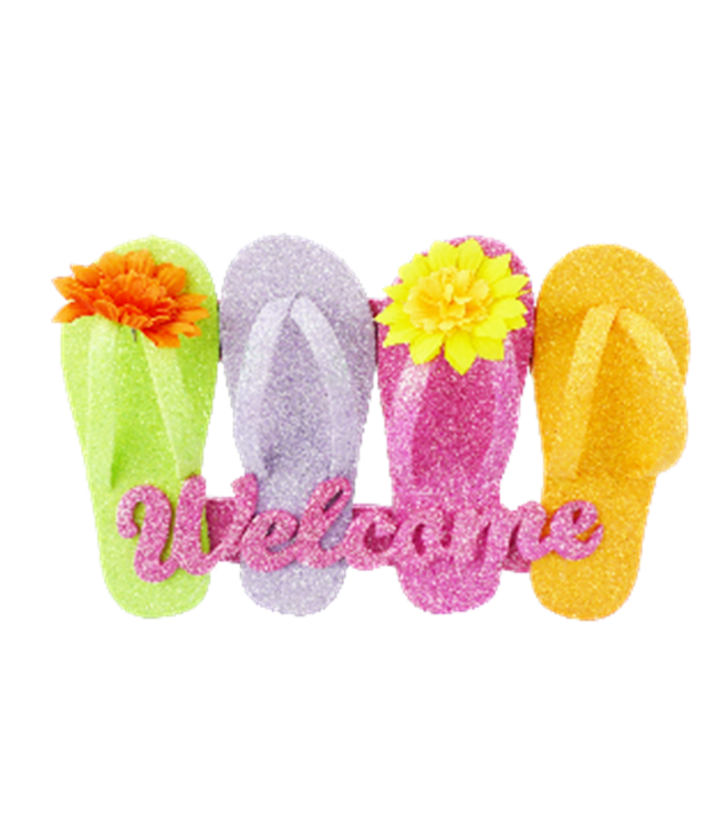 Two pairs of iridescent-glittered flipflops form a colorful base for this welcome sign.