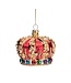 Red & gold glass ornament in the shape of a crown with gold cord hanger.