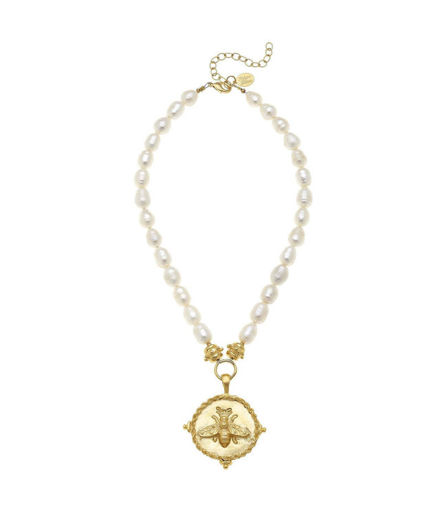 An elegant Gold Bee Pendant paired with a luminous, genuine freshwater pearl necklace.