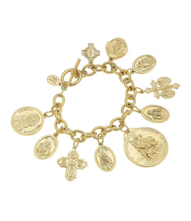 Experience the elegance and craftsmanship of the Gold Saints Charm Bracelet. This charm dangle bracelet, reflecting an inspiration from Northern European styling, is an exquisite addition to any jewelry collection.Â