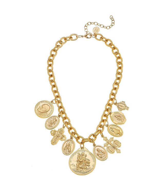 Add a touch of elegance to your outfit with this exquisite hand-cast gold saints charm necklace.