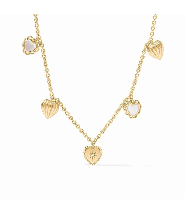 Vintage-inspired gold heart charms featuring sparkling gemstones, shimmering mother of pearl, and delicate latticework line a delicate adjustable rolo chain.