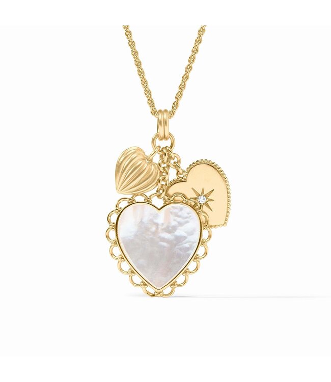 A trio of vintage-inspired golden hearts featuring sparkling gemstones, shimmering mother of pearl, and delicate latticework dance together on a delicate rope chain.
