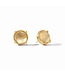 Rose cut sparkling gemstone of imported glass. Lightly hammered bezel setting with gold raised beads.