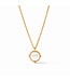 A faceted gemstone enhanced with four golden beads, dangling from a delicate cable chain.
