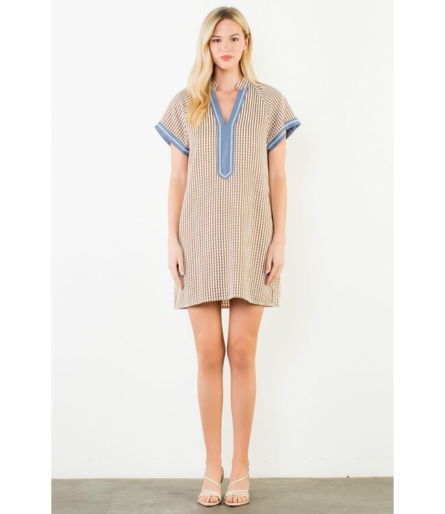 The Short Sleeve Gingham Patterned Dress is a casual, airy mini-dress featuring a classic small-scale checkered print in a warm tan and white color palette.