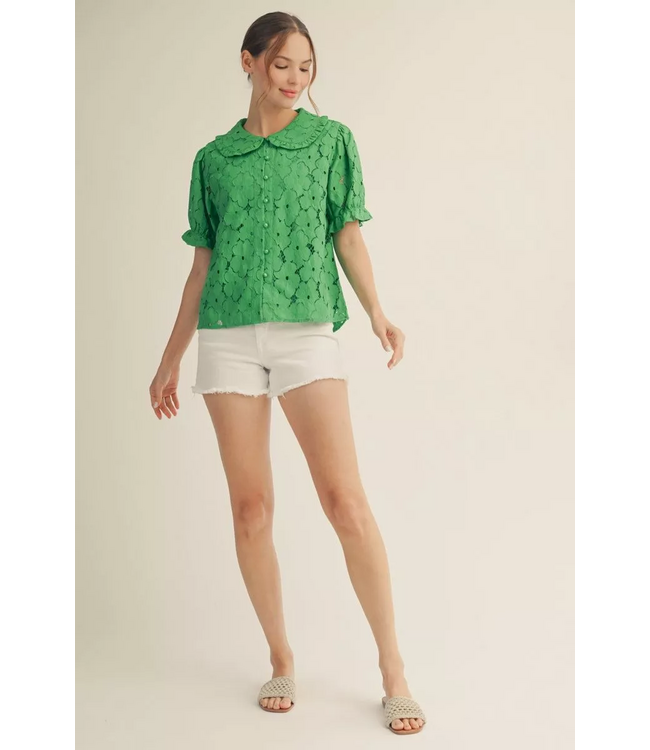 Elevate your look with this Short Sleeve Button-Down 3D Lace Top, featuring delicate lace details and a chic, feminine design for any occasion.