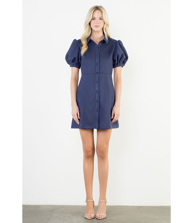 The Puff Sleeve Button Up Suede Dress is a structured mini-dress that combines vintage-inspired details with a modern, clean silhouette.