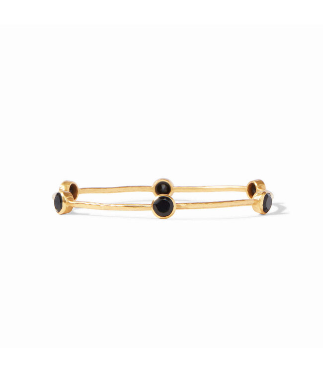 A lightly hammered bangle features six circular gemstones that sit along the length of this slim bangle, making it perfect for mixing and matching to create a striking color story on your wrist.