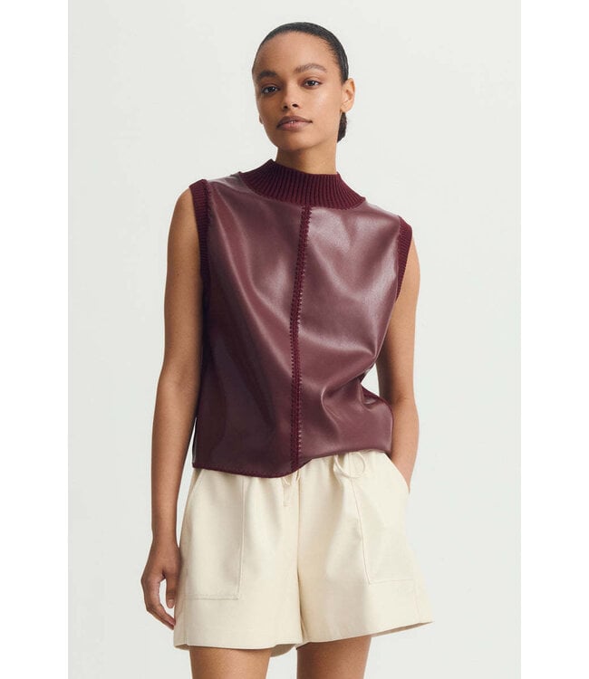 This top is characterized by its high ribbed mock neckline in a deep burgundy or maroon shade, which matches the ribbed trim at the armholes. Read more.