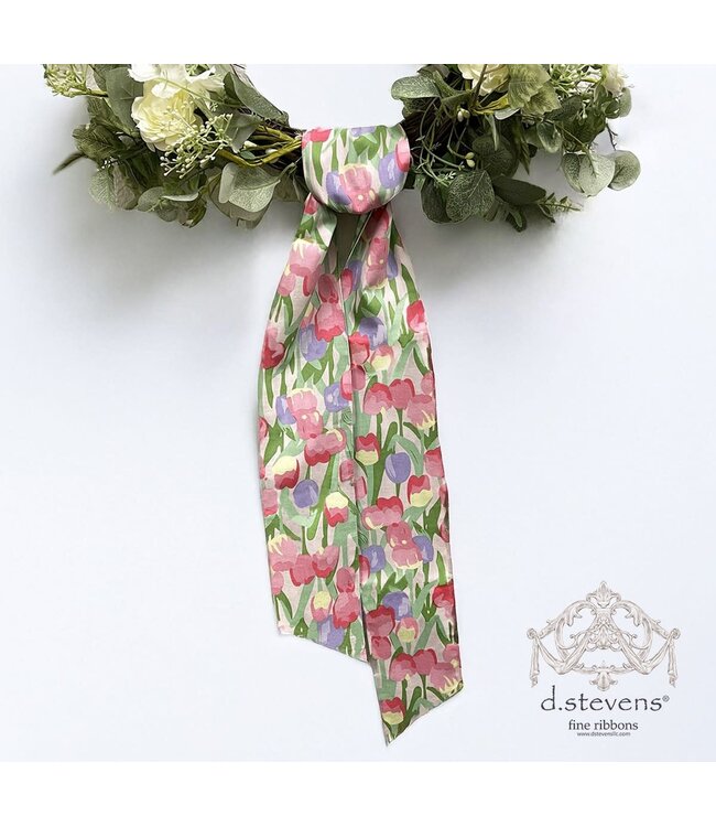 Add soft elegance with this Poplin Sash featuring pink & lavender watercolor tulips with check back. Perfect for spring décor and charming projects!