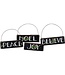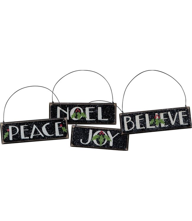 A set of four rustic wooden Christmas ornaments lending hand-lettered. Each piece features painted holly details and a mica coating for a snowy effect. Ornaments include wire loops for easy hanging.Â