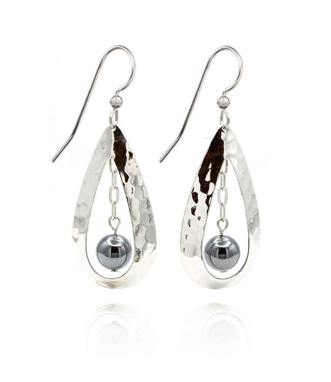 Sleek silver contemporary teardrop & bead earrings offer modern elegance and subtle shine, perfect for a chic everyday statement.