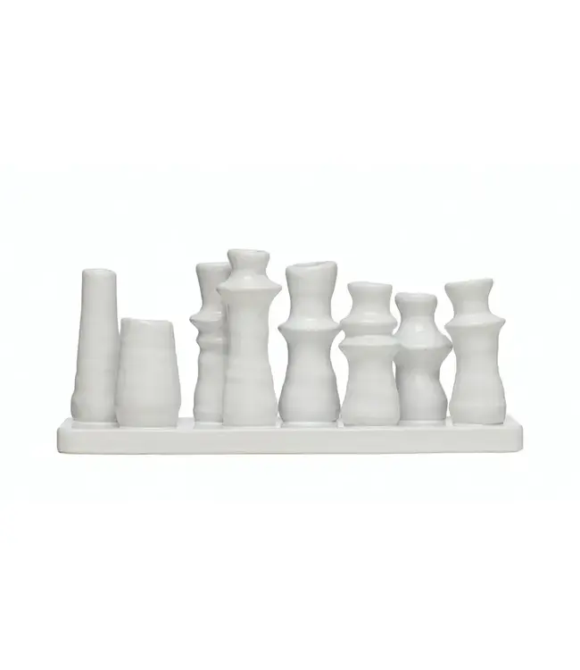 This unique stoneware vase showcases 8 bud vases fixed on a sleek tray. This vase can hold fresh or artificial flowers, candles, or other decorative items to create a lovely centerpiece or accent piece for any room.Â