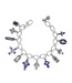 An elegant Unity Cross Blue Charm Bracelet featuring a silver-toned chain adorned with various blue and silver cross charms, some embellished with subtle details.