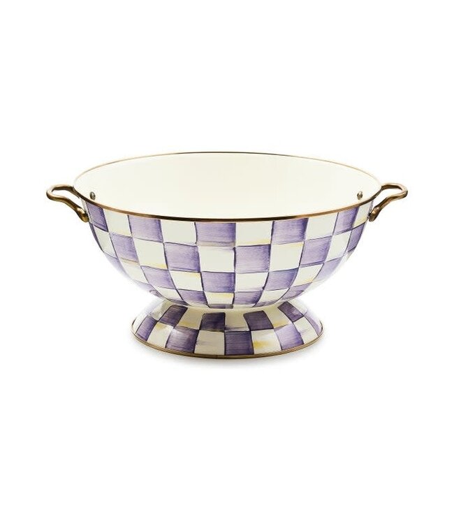 The Violet Check Everything Bowl, right-sized for beverages on ice or orchard-picked apples, is a must-have for parties and for everyday use. It features a heavy-gauge, hand-glazed steel underbody with hand-painted purple checks, a bronzed stainless-steel