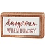 Displaying a unique hand-illustrated sentiment in red on a cream background that reads "Dangerous When Hungry." The box sign features a natural wood frame and faux enamel finish behind the design for a tile-like appearance. A fun food-themed everyday home