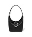 This is the Wyatt Shoulder Bag a sleek and structured black leather handbag featuring a curved silhouette, pebbled texture, and a bold silver-tone ring detail at the front.