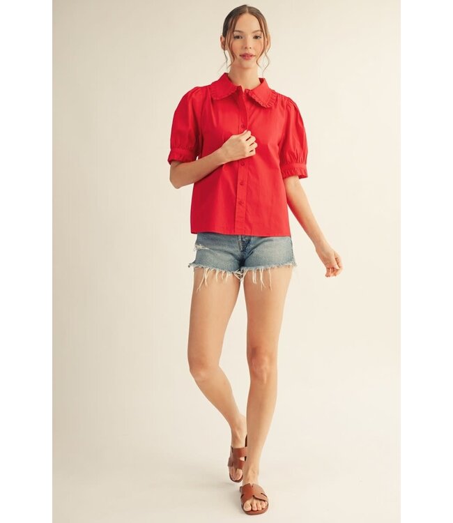 Charming Peter Pan collar top with classic button-down style. Perfect for effortless chic and timeless wardrobe flair!